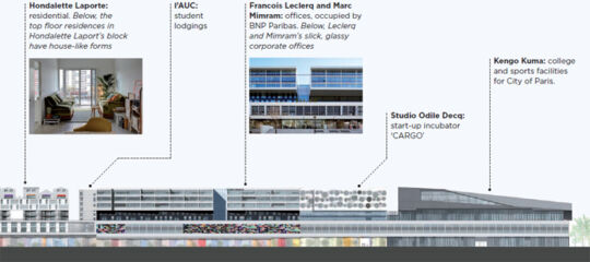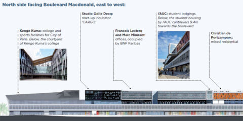 Il risultato è, al solito, abbastanza deludente. Se, infatti, da un lato emergono due progetti interessanti (la scuola media “Còllege Suzanne Lacore” di Kengo Kuma e il contenitore Cargo per start-up di Odile Decq), per il resto lo sviluppo architettonico ha prodotto un risultato bizzarro, con un confuso eclettismo. L’architettura francese non brilla in questo periodo storico, e di certo pesano sia i vincoli amministrativi, sia le differenti visioni degli investitori immobiliari che spesso pensano esclusivamente al concept di vendita. Assai deludente e datato Christian de Portzamparc con i giochi puramente formali di allineamenti della facciata; confuso sulla fronte principale e kitsch nel retro Hondelatte&Laporte con il social housing per giovani; più interessanti ma affogati in questo contesto gli edifici residenziali “metallici” di Brenac&Gonzalez, Habiter Autrement e FAA-XDGA e De Geyter Architects. Il premio al kitsch va tuttavia all’ostello per giovani di Stephane Maupin con un edificio che vuole riprodurre una «borsetta gigante di lusso per dare la possibilità a tutti di avere questa visione di benessere irraggiungibile». Non a caso, tutti questi interventi sono posizionati sul fronte sud, dove sicuramente c’è stata poca attenzione al controllo generale sul progetto, ad eccezione della testata occupata del liceo di Kuma. Per il resto, il risultato è molto discutibile e la vista dalla massicciata della metropolitana abbastanza deprimente.