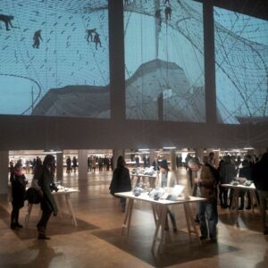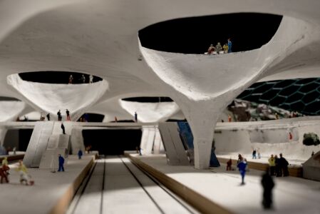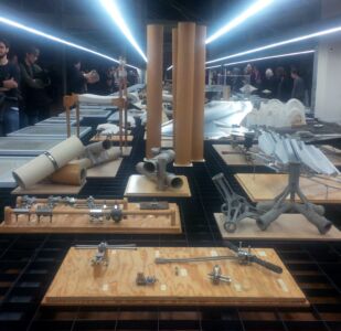 A gigantic media-tech projection, suspended in the aisles of the ZKM -media art research centre- interprets the idea of architecture in intangible, audio-visual and sensorial structures, by exploring through Frei Otto’s work the cognitive experiences and intuitions gathering in models as constant sources of self-analysis and self-generated experimentation with technical, artisanal, artistic and multimedia abilities. Multi-vision that expands in the configuration of the arrangement. A multicellular organism, rarefied in a constellation of tables, shelves, lamps, supported by a maze of cables that enhance the heights and the widths of the point structure hosting the ZKM: one of the largest industrial buildings in Germany at the threshold of modernity, designed by Philip Jakob Manz during WW1 as an arms and ammunitions factory, now historical heritage. The minimal, spare setup for Frei Otto’s exhibition “Denken in Modellen” – curated by Georg Vrachliotis, with Sabiha Keyif for the ZKM, co-produced by the SAAI (Südwestdeutsches Archiv für Architektur und Ingenieurbau) of the KIT-Karlsruhe Institute of Technology and by the Wüstenrot foundation – draws from a limited glossary of displays that operates by the overlapping of semantic settings: study-exhibition/work-procedure. Thinking in models is the constant that bonds investigation-verification-work, displayed object- setup, translated into the environment of a real open-source extra-terrestrial lab, in perfect harmony with the ZKM’s mission, where display-research-archive are experienced as a magmatic unity of ideas. Slowed-down by meandering through the layering of surfaces and micro-narratives, the cosmonaut-observer reaches at last the galaxy of models: more than 200 pieces, comprising models, tools and prototypes, float on a huge metal surface of black plate rendered invisible by the cast of neon lights, thus freeing the viewer’s gaze to enter into the cognitive universe of Frei Otto.