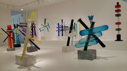 Apprendere a diretto contatto di oggetti che possono vivere di vita propria è certo un eccellente modo di confrontarsi con la realtà. Tuttavia, al di là dall’affascinante sinfonia di tinte e forme, leitmotif leggibile nella superficie di questa mostra, gran parte dei visitatori potrebbe non comprendere pienamente l’ardua téchne fondata nella tradizione muranese e la sete inesausta di ricerca che ha spinto Sottsass a osare oltre le Colonne d’Ercole della consuetudine, producendo gli esemplari più singolari (vetro maritato con plastica, corian, colle e altri materiali).