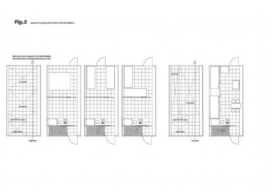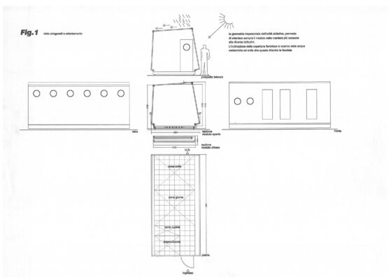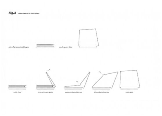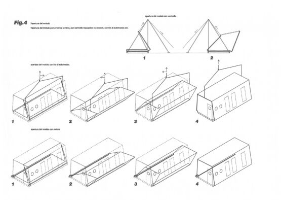 Descrizione: Il progetto riguarda la definizione di uno spazio abitativo minimo – a sezione trapezoidale e ripiegabile su se stesso per lo stoccaggio – trasportabile e studiato in modo da adeguare la propria geometria alle esigenze di trasporti leggeri e veloci mantenendo semplicità e rapidità di installazione nonché adattabilità al luogo, nel quale viene posizionato con l’orientamento più idoneo. Dalla relazione di brevetto: «Un vantaggio di un’unità abitabile così definita è il suo ridotto ingombro e una notevole compattezza quando essa è completamente ripiegata: è possibile ottenere moduli prefabbricati con un rapporto, tra il volume abitabile interno e il volume del modulo ripiegato, particolarmente elevato. La forma del modulo ripiegato a parallelepipedo permette l’impilaggio di diversi moduli e una notevole efficienza di trasporto […] Tali strutture non sono inoltre vincolate all’aspetto del parallelepipedo, ma l’invenzione permette una notevole libertà di forme esterne, con conseguenti vantaggi estetici unitamente alla possibilità di ottenere unità abitative che, introducendo opportune dissimmetrie nella loro struttura, sfruttino più efficacemente rispetto alla tecnica nota i vantaggi di un’orientazione ottimale dell’unità rispetto al sole, ai venti dominanti e ad altri fattori ambientali locali. Questi vantaggi non prescindono da una migliorata rapidità e facilità d’installazione e dalla possibilità di ripiegare e riutilizzare più volte lo stesso modulo prefabbricato».