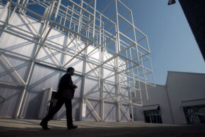 All’esterno il padiglione fiorisce in un aggregato di cubi, che si assommano sulla copertura e sulle pareti dell’edificio in un gioco di accostamenti che pare suscettibile di nuove aggregazioni e compone spazi disponibili ad annunciare in molti modi le mostre all’interno, come è già accaduto ricevendo le proiezioni dei graffiti virtuali di Rusty Young, nella serata inaugurale, accompagnati all’interno dal maestro Ezio Bosso e dalla STRADIVARIfestival Chamber Orchestra. Dal punto di vista linguistico, un peccato che la teoria dei cubi non sia effettivamente portante, e che all’interno la leggerezza della struttura molecolare sia supportata da un ritmo piuttosto serrato di pur eleganti pilastrini perimetrali in acciaio che, dipinti di bianco, hanno almeno il merito di sparire quasi allo sguardo. Resta poi il dubbio sui materiali, perché se il policarbonato sta diventando un materiale ricorrente in architettura, esso ha caratteristiche coibenti piuttosto scarse: forse, allora, a livello energetico questo nuovo padiglione consuma quanto la restante parte della Fondazione risparmia.