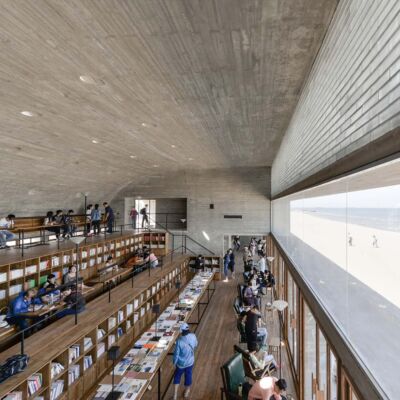 La biblioteca dei pechinesi Vector Architects sorge a bordo di una spiaggia di fronte al golfo di Bohai, sulla costa nord-orientale della Cina. L’intervento è stato realizzato all’interno del resort residenziale di Aranya, progetto immobiliare incentrato sulla dimensione comunitaria. L’edificio trova la sua forza espressiva nel contrasto tra il rigoroso volume in calcestruzzo armato faccia a vista e le fasce orizzontali con cui si articola il paesaggio: la sabbia bianca dell’arenile, il blu del mare, l’azzurro del cielo. La costruzione ospita al suo interno diverse attività che si snodano su due livelli: una sala di lettura, uno spazio per la meditazione ed un bar. I prospetti e la sezione – che varia per ogni ambiente – presentano un notevole interesse compositivo in grado di mettere in risalto le superfici in calcestruzzo, la luce naturale e la relazione visuale con l’esterno. La sala di lettura, caratterizzata da una copertura curva capace di inquadrare l’intorno e guidare la luce sulle superfici interne, si compone di una grande gradonata rivolta verso il mare. Il progetto, attraverso una grande vetrata, sottolinea la forte continuità visiva e fruitiva tra interno ed esterno.
