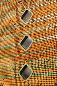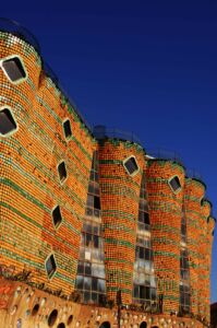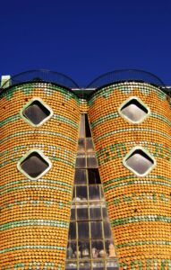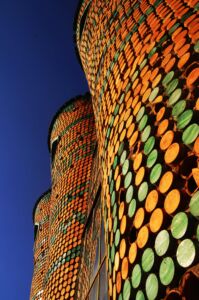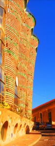 La gioiosa facciata esterna a moduli conoidali convessi è un blocco strutturale organico e continuo. Come le volte romane e bizantine realizzate a partire da tubi fittili, gli elementi sinuosi sono strutturali. Si combinano ferretti d’acciaio e tubi ceramici, a riprendere concettualmente l’idea dell’«opus moderno» dei blocchi sperimentati da Wright nelle case californiane degli anni venti.