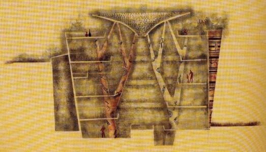 Il cuore interno è animato dal serrato dialogo fra la struttura arborea e la rampa continua che distribuisce le funzioni principali dei quattro stadi di lavorazione ceramica, sviluppandosi in lunghezza ed incapsulando un grande invaso centrale a tutt’altezza, sormontato da un lucernario atto anche alla raccolta delle acque piovane. La copertura a spiovente invertito verso il lucernario prevedeva la messa in opera di un giardino pensile utile anche come scambiatore termico, come le aperture posizionate in modo da garantire il funzionamento organico e passivo degli ambienti interni. L’invaso centrale, alto quindici metri e modellato dalla luce zenitale, respira involucrato dalla struttura di grandi alberi, tronchi e rami rastremati che obbediscono alle leggi della statica ed esplicitano gli sforzi nella loro morfologia. Il tetto a spioventi invertiti, come nella Cappella di Ronchamp, canalizza l’acqua piovana in pochi punti centrali, per poi conservarla e riutilizzarla. La sezione trasversale del cuore centrale ha le stesse inclinazioni e proporzioni dello spazio allungato dell’antro della Sibilla a Cuma, sicuramente noto a Soleri. In facciata, le curve delle volte amalfitane si trasformano in absidi, mentre le cupole maiolicate tipiche della zona si trasfigurano in pelle verticale.