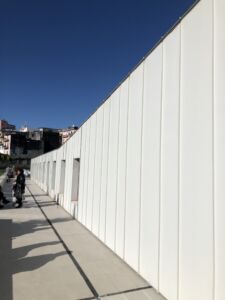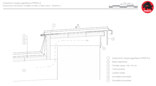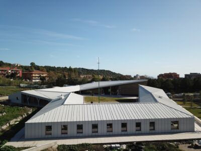 In fase di redazione del definitivo, i progettisti hanno scelto il materiale che meglio interpretasse tale filosofia. La copertura e le facciate esterne – per una superficie totale di 3.600 mq – sono state completate con la posa di una lamiera di rivestimento in alluminio Prefa (azienda austriaca leader nei sistemi di rivestimento in alluminio) 0,70 mm (Prefalz ®), ancorata con un sistema a doppia aggraffatura su supporto continuo aerato predisposto. Una simile soluzione costruttiva ha permesso di fruire di un tetto ventilato, caratterizzato da una superficie dalla cromia chiara che riduce il surriscaldamento delle superfici e l’effetto isola di calore. Le principali problematiche affrontate in fase progettuale e realizzativa si sono presentate nella scelta del giusto dettaglio (colore e matericità) e nell’individuare il miglior elemento di raccordo e continuità formale che rendesse omogeneo il linguaggio tra copertura e facciate.